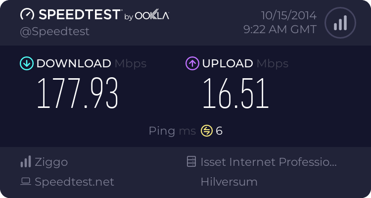 Ik heb een Ziggo 180Mbps downloadsnelheid en volgens Speedtest.net haal ik die snelheid ook bijna.