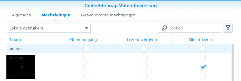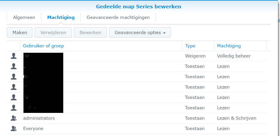 Ik heb via Filestation een nieuwe machtiging aangemaakt