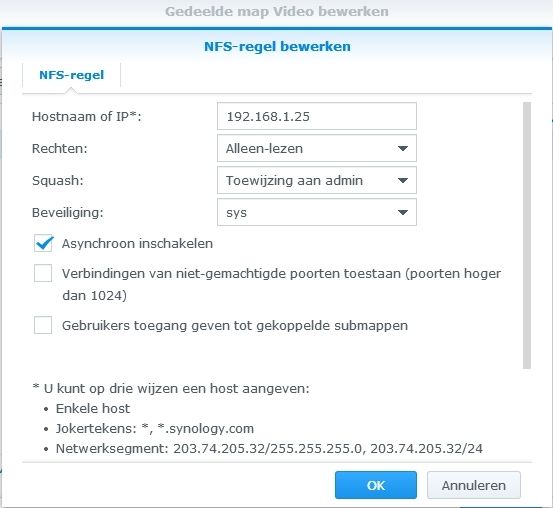 Ik heb geprobeerd om een nieuwe regel aan te maken met alleen een * maar dit werkte ook niet (deze heb ik naast de bestaande regel van 192.168.1.25 gemaakt). Ik kies voor 'alleen lezen' omdat ik niet wil hebben dat de mediaspeler perongeluk media wist.