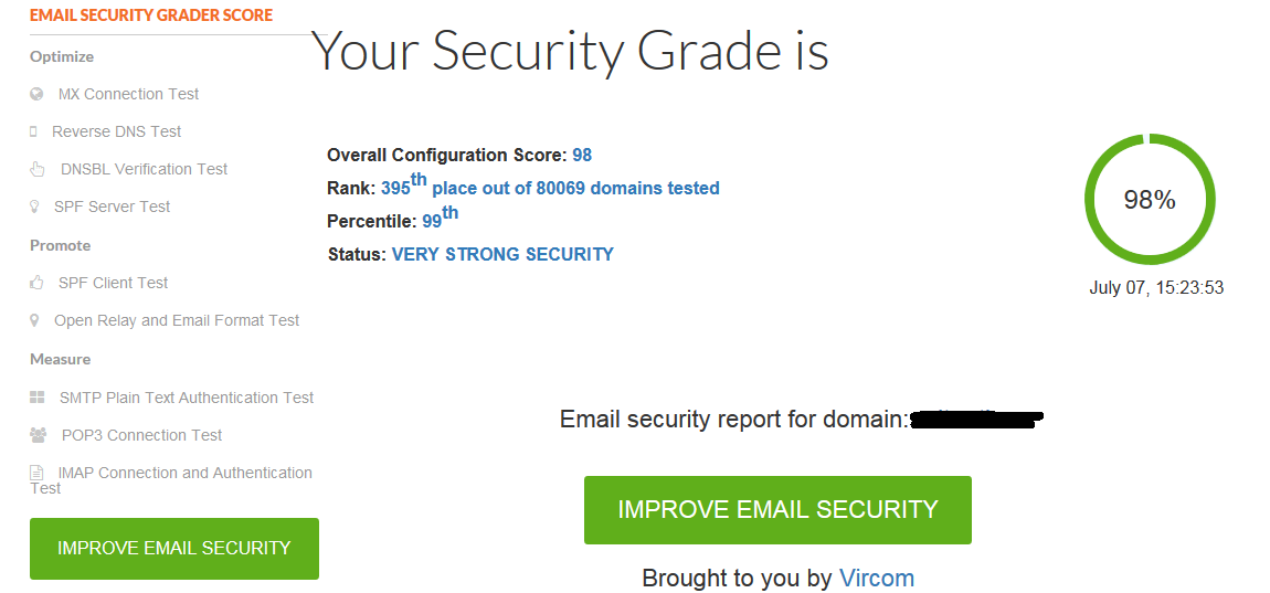 Mijn mailserver scoort 56% en is "Average secure". Geen idee of dit goed is. Als ik mijn Ziggo mail adres scan, is dat 91% en "strong".