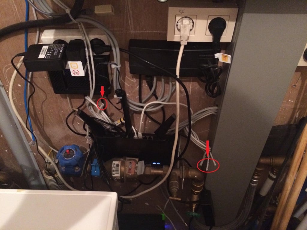 Ik zou wel kijken of ik een plank in de kast kon monteren om daarop dan de switch en de router te plaatsen, in plaats van de router zo achter de waterleiding te klemmen.