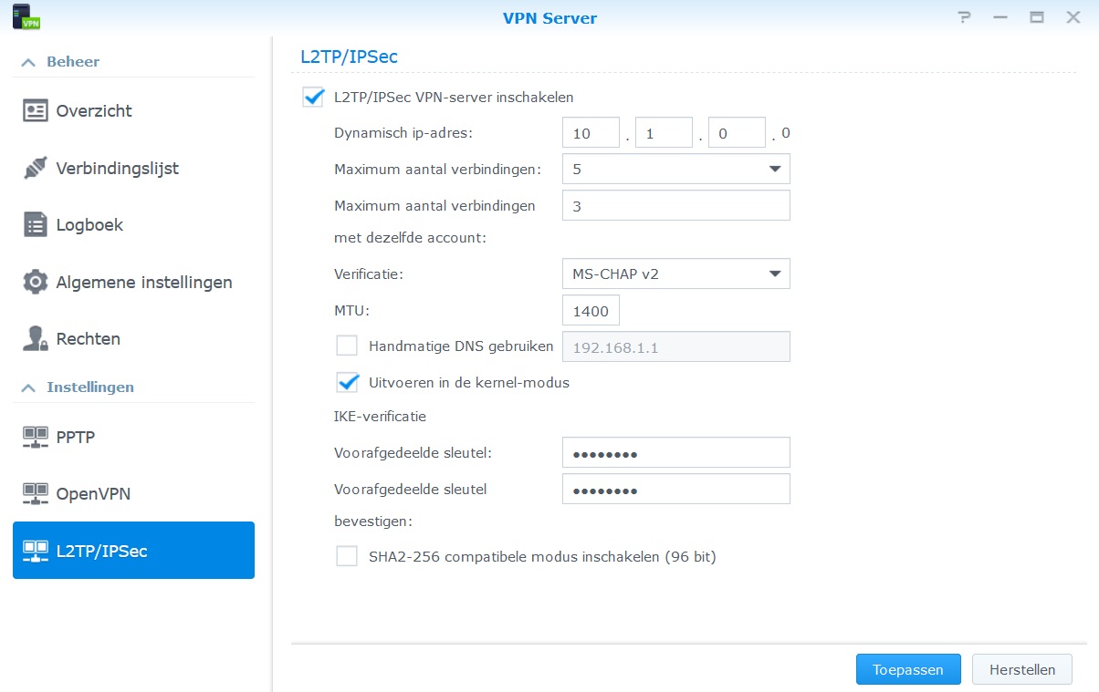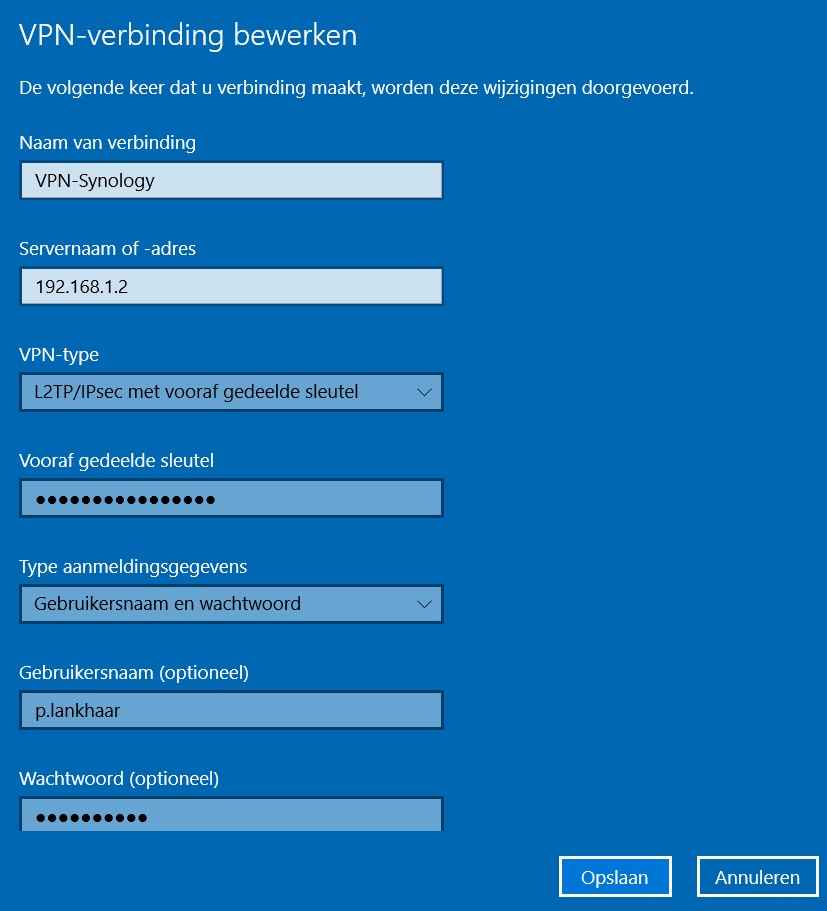 Via L2TP in Windows een nieuwe netwerk VPN verbinding gemaakt en ingesteld.